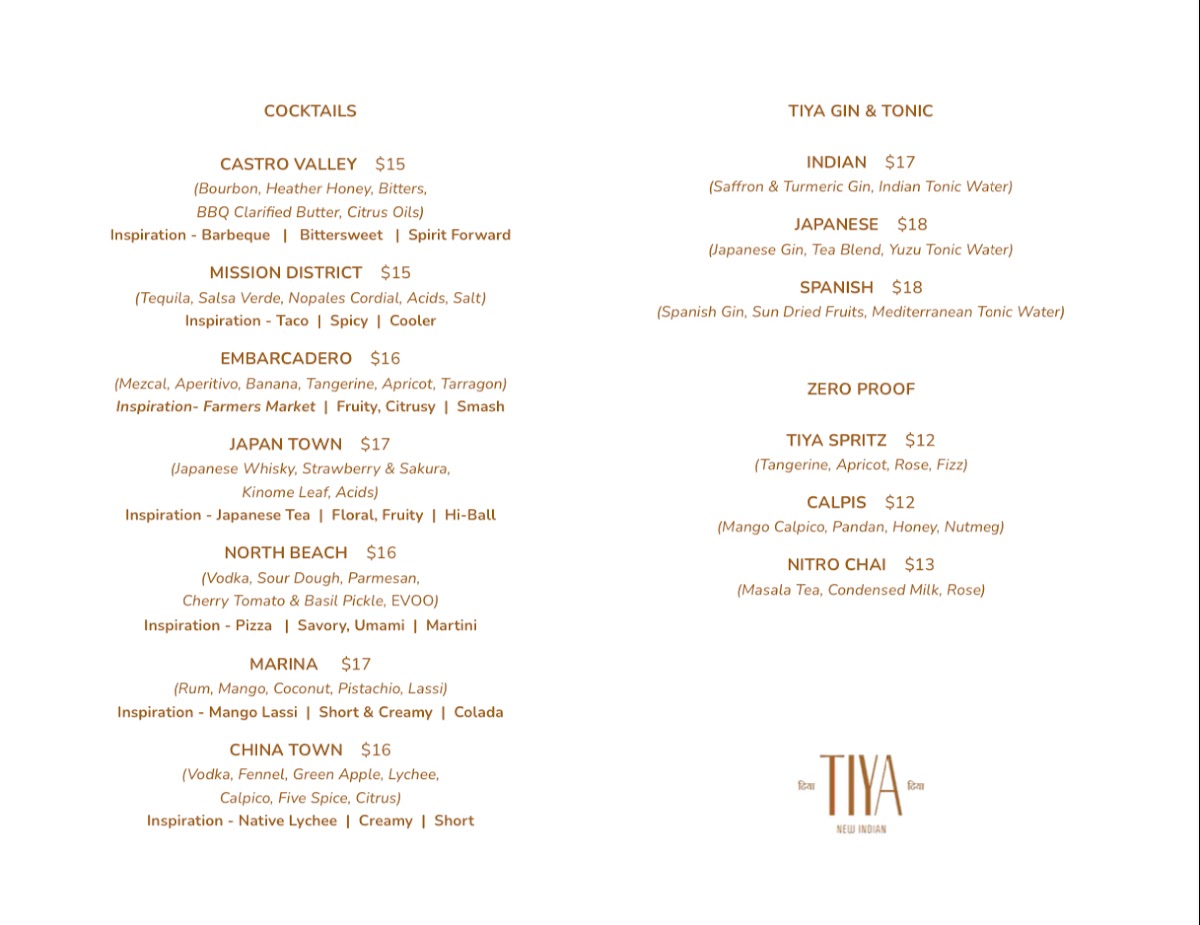 Introducing the menu at Tiya - San Francisco, where the essence of Indian cuisine is reimagined through culinary artistry. Located in the heart of the Marina district, Tiya stands out with its innovative offerings that include large plates such as Eggplant & Poblano Dumpling and Butter Chicken, each priced around $30-$48. Guests can also delight in signature dishes like Bhetki Paturi and Lamb Shank Roast, crafted with a perfect balance of traditional spices and modern flair.